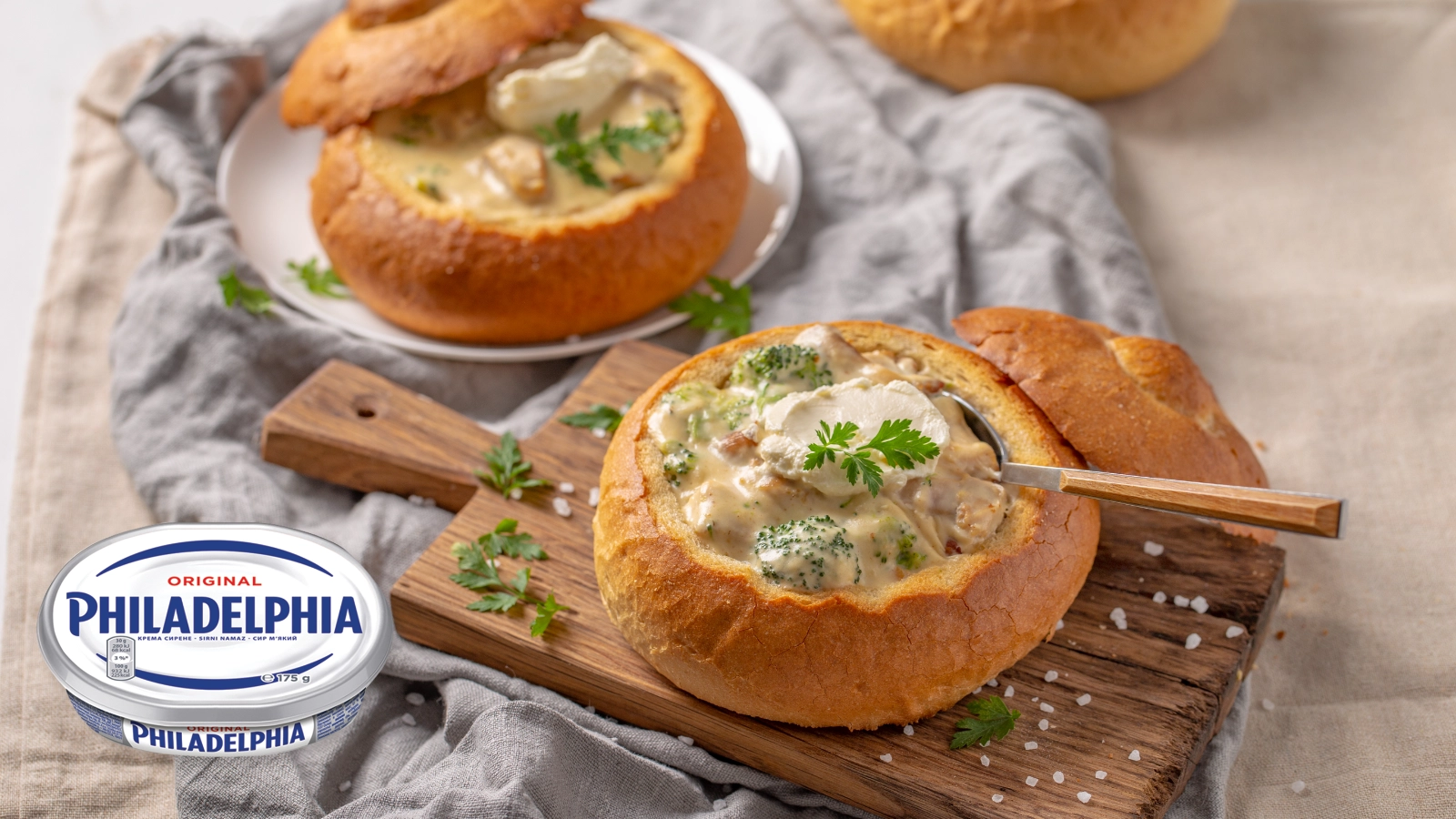 Sastojci: -375 g krem sira Philadelphia -3 izdubljena kruha za juhu (oko 450 g) -200 g mesa od pilećeg batka -10 ml ulja -200 g brokule -220 ml pilećeg temeljca